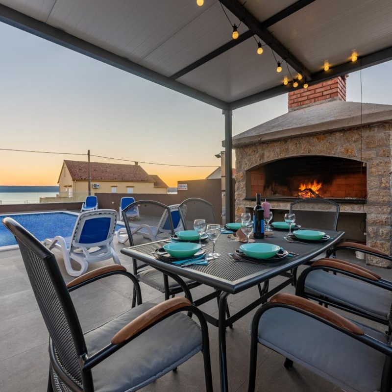 Kameni roštilj pored bazena napraljen u dalmatinskom stilu. Sva potrebna oprema za spremanje roštilja bit će pripremljena za vas.
